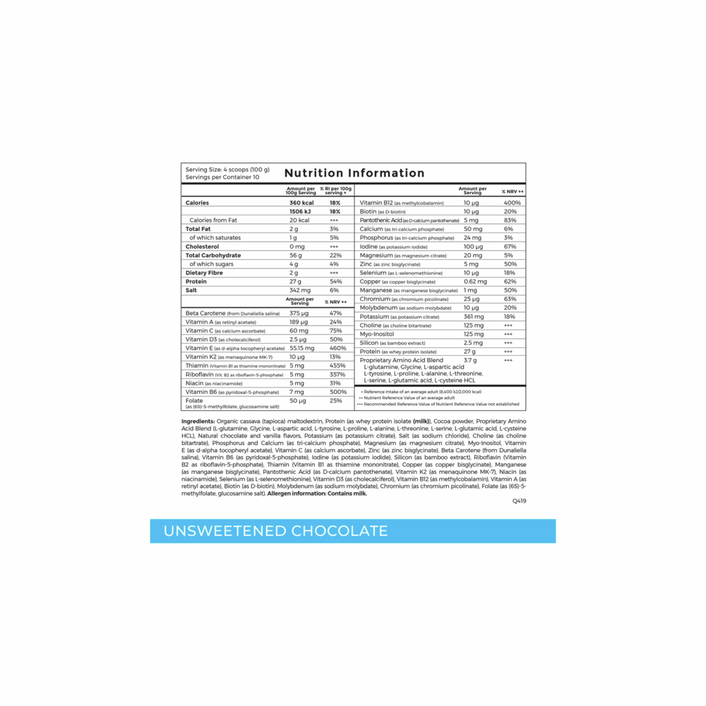 Organic cassava (tapioca) maltodextrin, Protein (as whey protein isolate (milk)), Cocoa powder, Proprietary Amino Acid Blend (L-glutamine, Glycine, L-aspartic acid, L-tyrosine, L-proline, L-alanine, L-threonine, L-serine, L-glutamic acid, L-cysteine HCL), Natural chocolate and vanilla flavors, Potassium (as potassium citrate), Salt (as sodium chloride), Choline (as choline bitartrate), Phosphorus and Calcium (as tri-calcium phosphate), Magnesium (as magnesium citrate), Myo-Inositol, Vitamin E (as d-alpha tocopheryl acetate), Vitamin C (as calcium ascorbate), Zinc (as zinc bisglycinate), Beta Carotene (from Dunaliella salina), Vitamin B6 (as pyridoxal-5-phosphate), Iodine (as potassium iodide), Silicon (as bamboo extract), Riboflavin (Vitamin B2 as riboflavin-5-phosphate), Thiamin (Vitamin B1 as thiamine mononitrate), Copper (as copper bisglycinate), Manganese (as manganese bisglycinate), Pantothenic Acid (as D-calcium pantothenate), Vitamin K2 (as Menaquinone MK-7), Niacin (as niacinamide), Selenium (as L-selenomethionine), Vitamin D3 (as cholecalciferol), Vitamin B12 (as methylcobalamin), Vitamin A (as retinyl acetate), Biotin (as D-biotin), Molybdenum (as sodium molybdate), Chromium (as chromium picolinate), Folate (as (6S)-5-methylfolate, glucosamine salt).