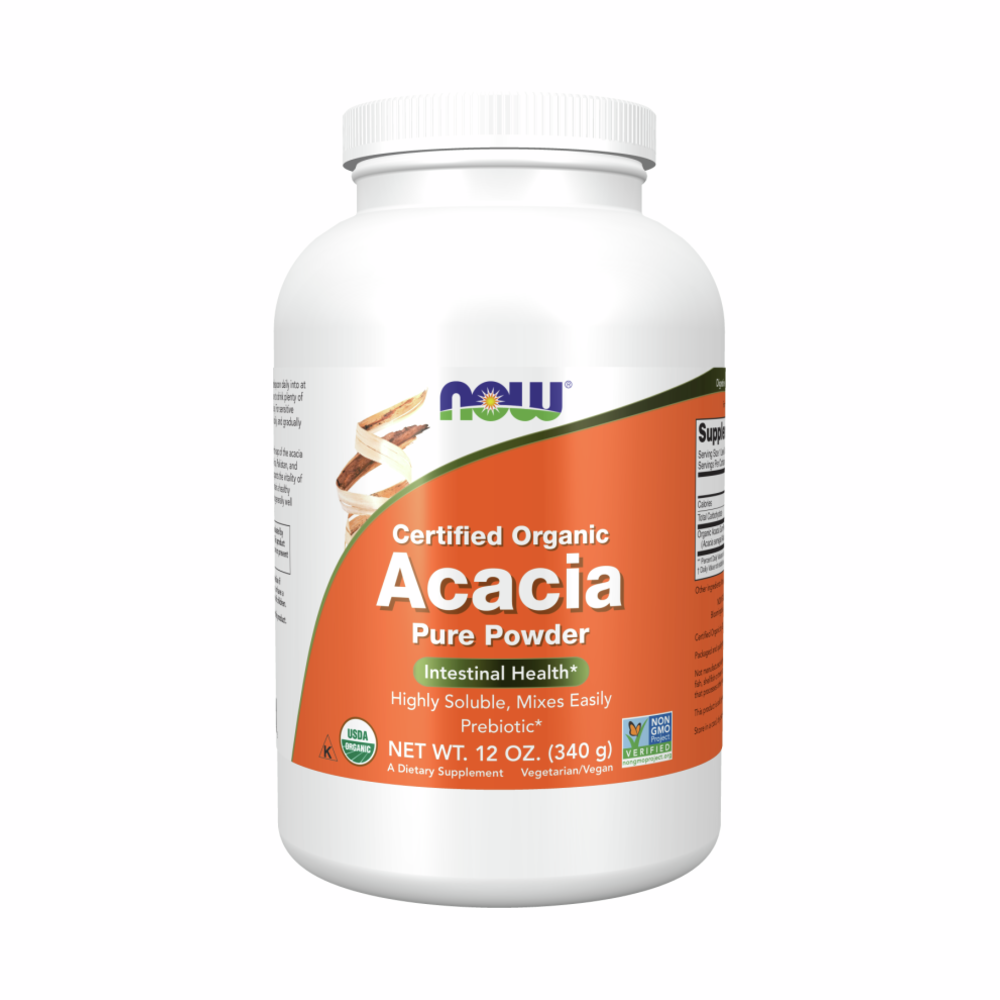 Organic Acacia Powder from NOW Foods is harvested from the sap of the acacia tree and supplements prebiotic activity in the gut.