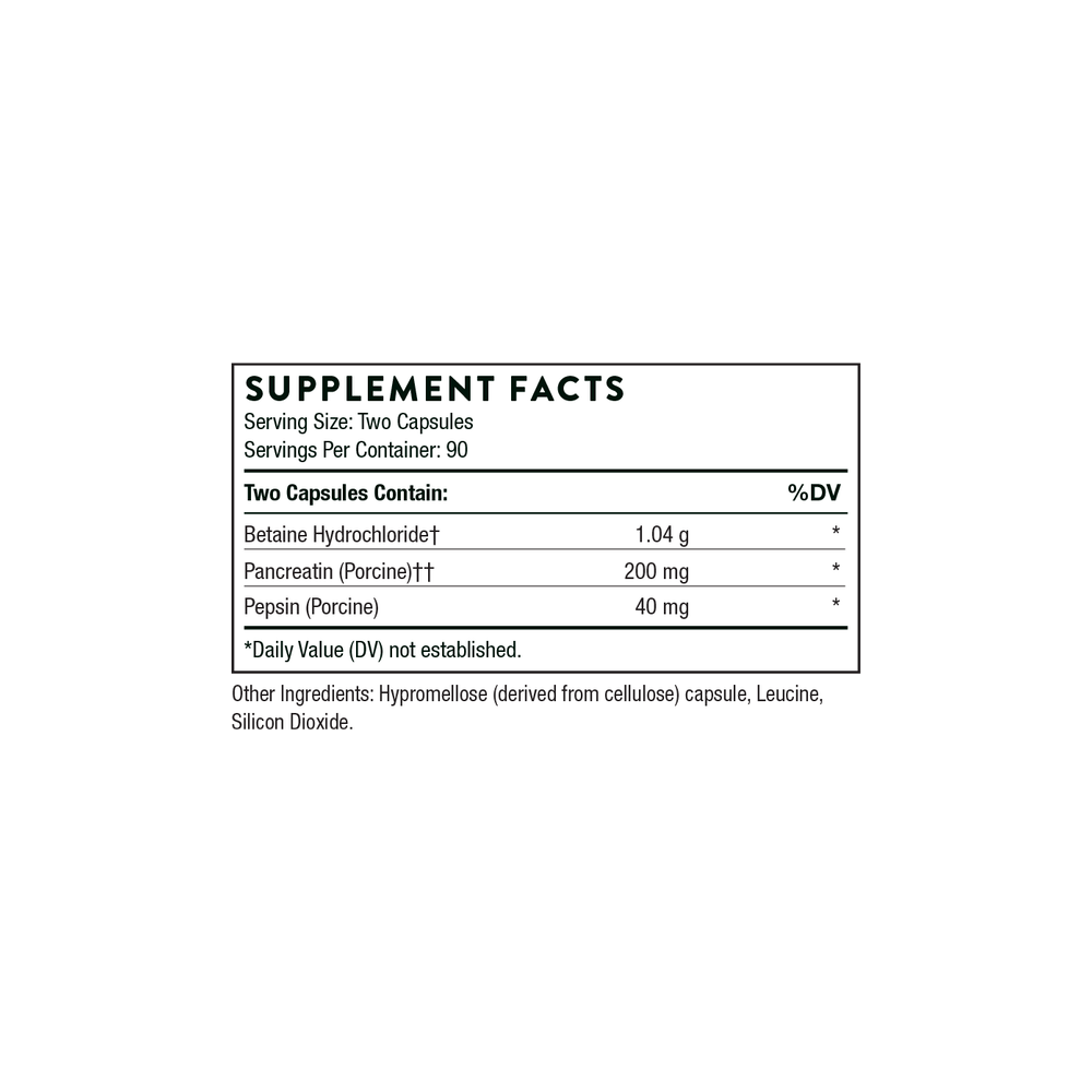 A comprehensive digestive enzyme blend of HCl, pepsin, and pancreatin for supporting good digestion.