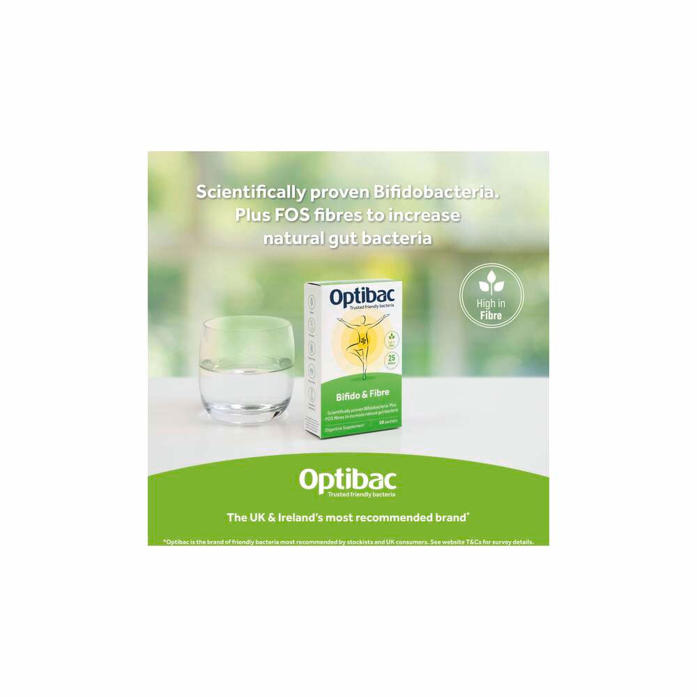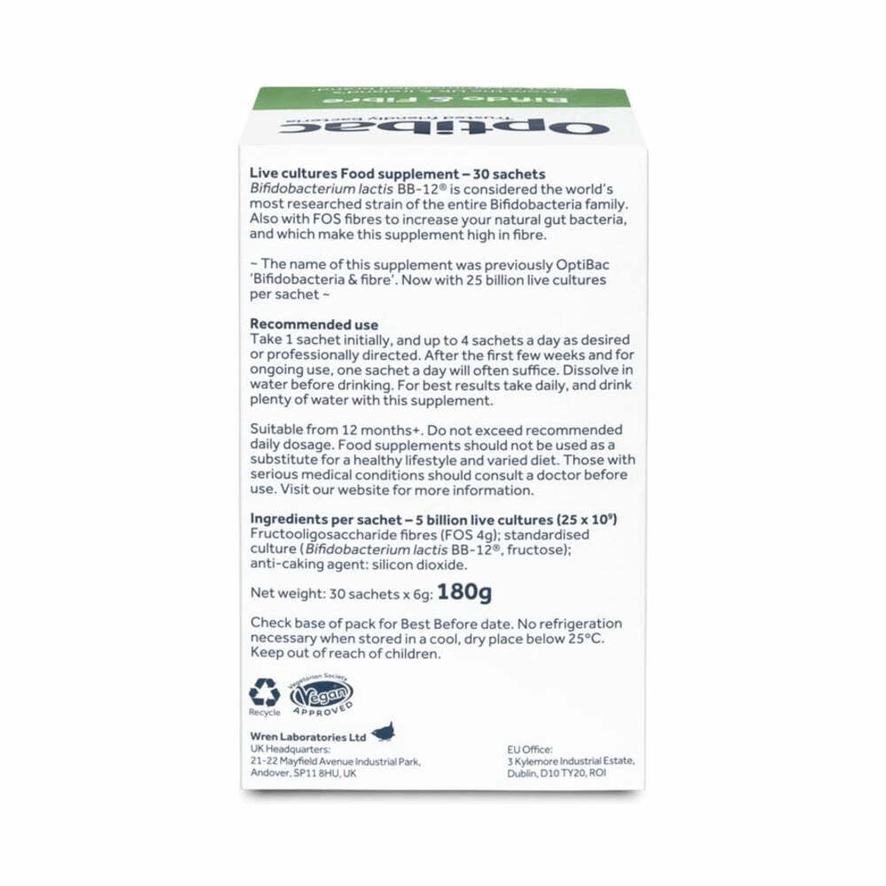 Optibac Bifido & Fibre is a high quality supplement combining 25 billion live cultures of the scientifically proven Bifidobacterium lactis BB-12. Also with 4g of FOS fibres added to increase your natural gut bacteria.