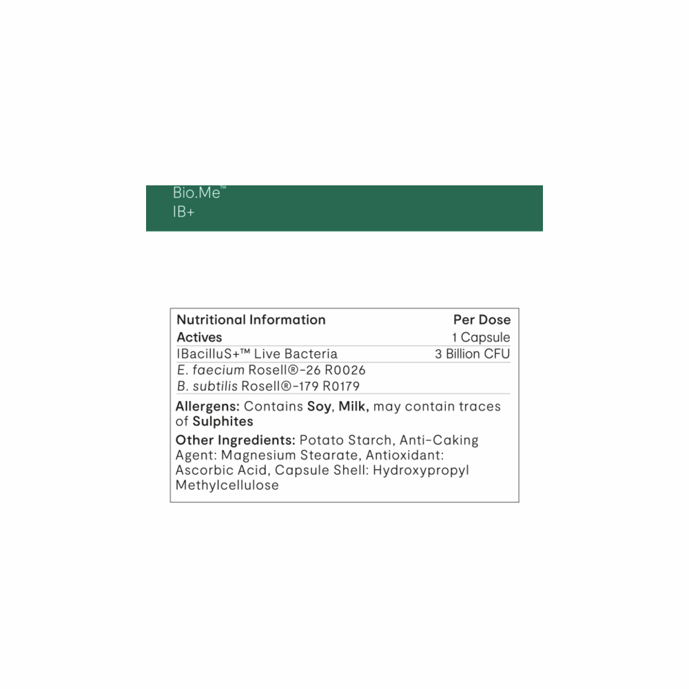 Bio.Me™ IB+ contains the bacterial strains Enterococcus faecium Rosell®-26 (R0026) and Bacillus subtilis Rosell®-179 (R0179). This combination has been extensively studied in humans, appearing in over 140 clinical studies for its impact on gut health, especially in relation to irritable bowel disease (IBS), Inflammatory bowel disease (IBD), reflux and SIBO.