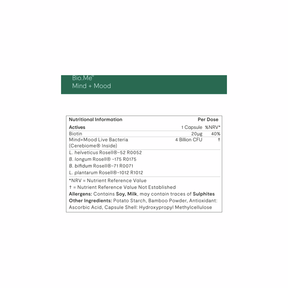 Bio.Me Mind + Mood is a clinically researched probiotic formulation with biotin to support the nervous system and psychological function.