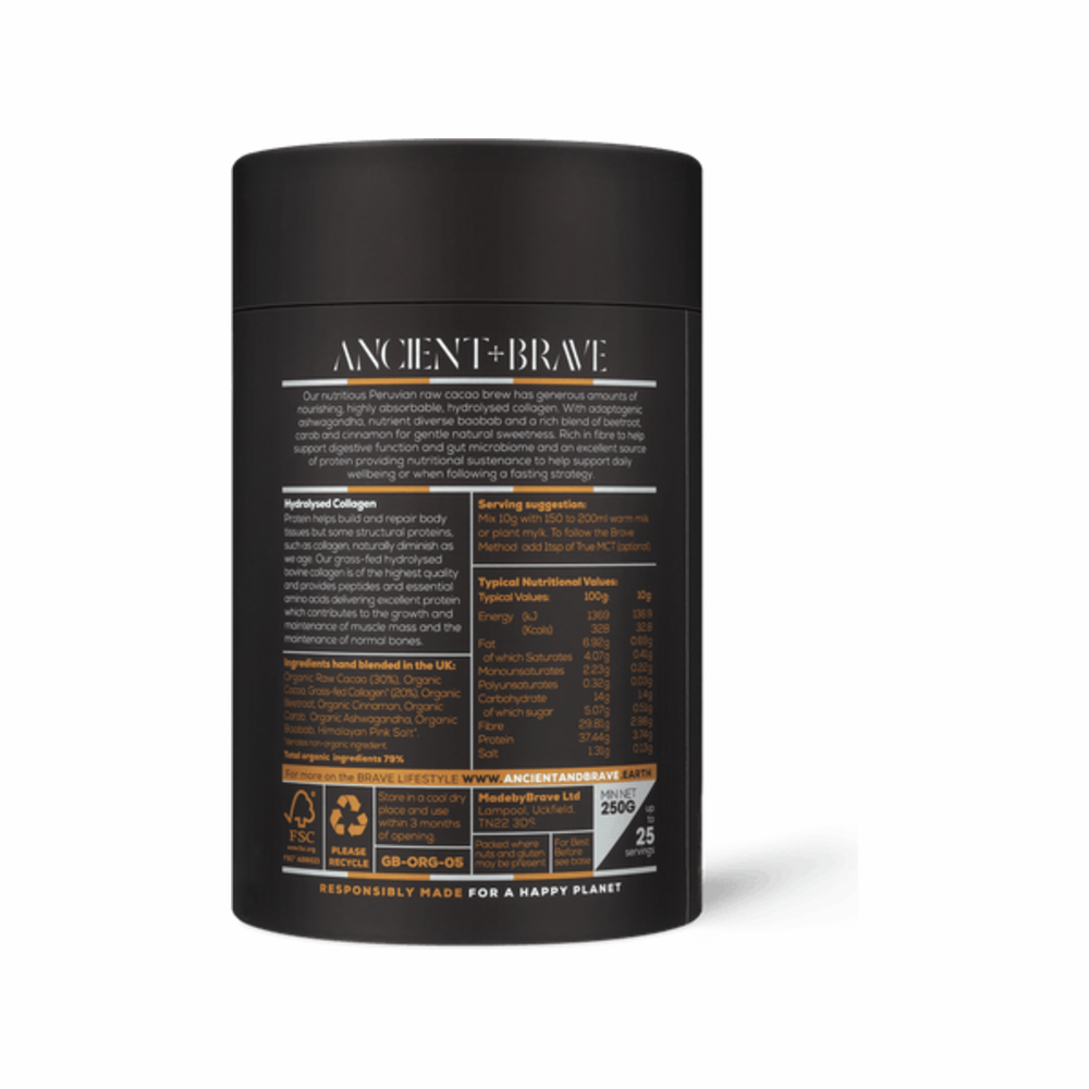 Cacao + Collagen is a delicious blend of luxury Peruvian raw cocoa and collagen in the form of highly absorbable hydrolysed collagen peptides. This formula also contains the adaptogen ashwagandha, which helps the body manage stress and supports relaxation.