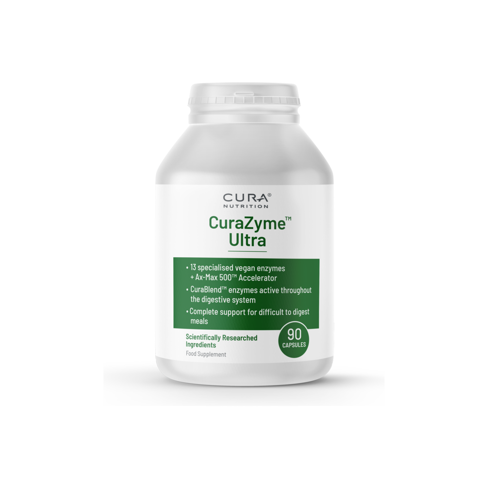CuraZyme™ Ultra is a potent enzyme formula with 13 specialised enzymes, each one carefully selected for its unique ability to break down different types of food ingredients. Ax-Max500™, the proprietary enzyme accelerator, is added to significantly speed up and increase the potency of the digestive enzymes.