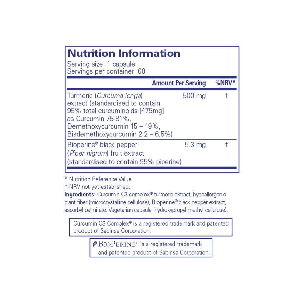Curcumin 500 with Bioperine by Pure Encapsulations has been formulated to improve the absorption of curcumin, which is typically not easy for the body to absorb. Studies have found the addition of Bioperine from black pepper can significantly improve absorption. Curcumin is the active compound in turmeric.