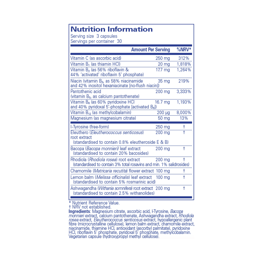 This formulation would benefit those with busy lifestyles. It contains a comprehensive profile of magnesium, vitamin C and B vitamins to support energy production and also contribute to normal psychological function. The combination of vitamins and minerals contributes to a healthy immune system and provides antioxidant support. The plant extracts include lemon balm, ashwagandha and chamomile, to contribute to a calmer mood. Adaptogens like rhodiola and Siberian ginseng support stamina and mental capacity.
