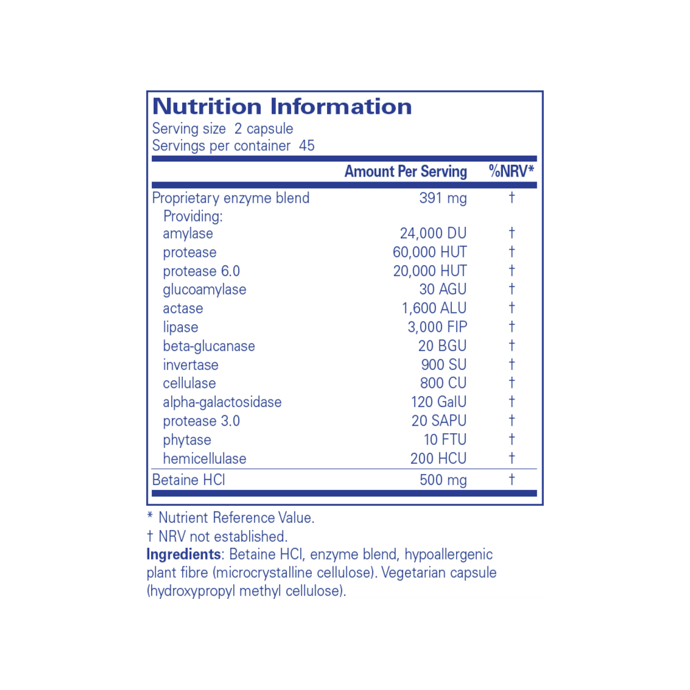 Digestive Enzymes Ultra with Betaine HCl can be beneficial for those who struggle to break down and process foods. When food cannot be digested properly, it cannot be absorbed very well either. This supplement may help to break down the most common food groups that people struggle to digest such as lactose, legumes, fats, fibre and protein. It also contains alpha-galactosidase which can help break down high FODMAP foods such as certain fruits and vegetables, legumes and grains. The addition of Betaine HCl helps to increase stomach acid, which can be low for a variety of reasons, and is needed to help with the digestion of food, and the absorption of nutrients, whilst also protecting the body from harmful bacteria ingested from food.