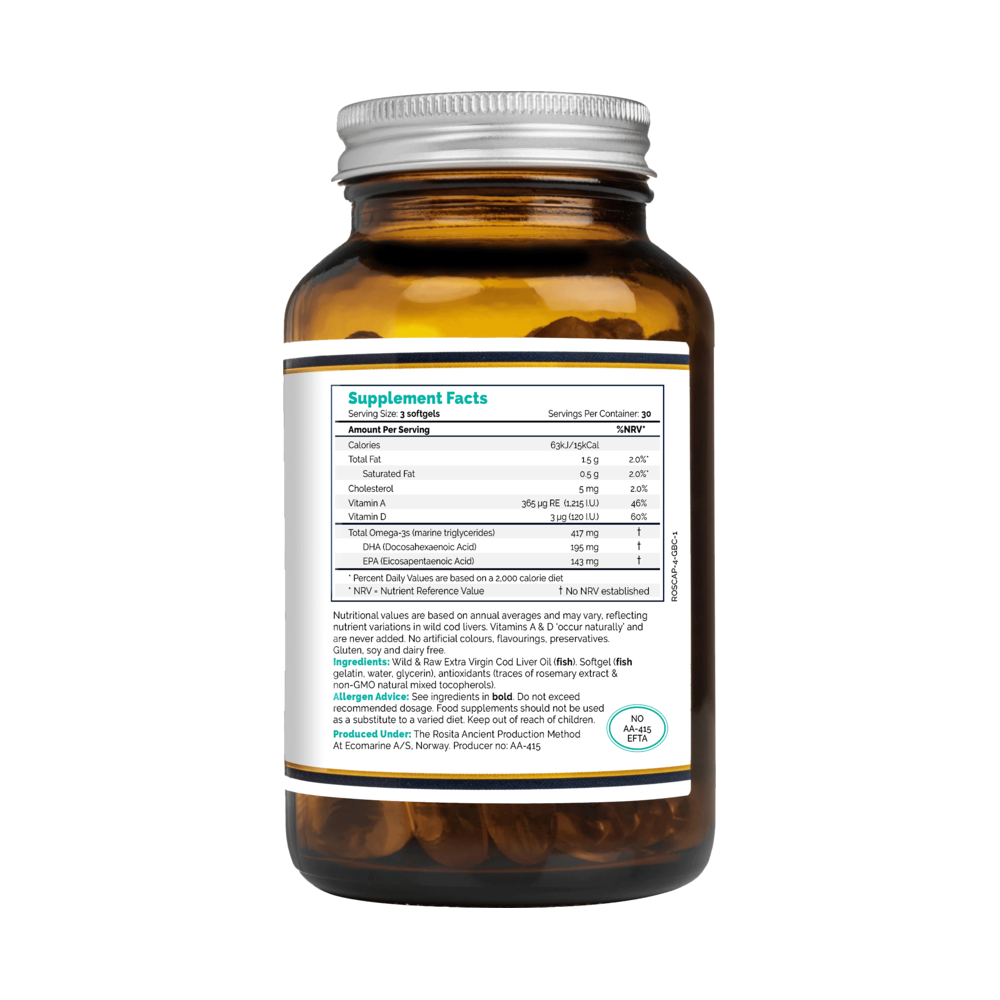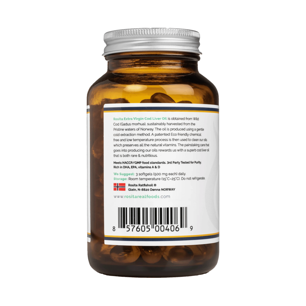 Rosita’s Extra Virgin Cod Liver Oil capsules contain pure cod liver oil from the pristine waters of Norway.