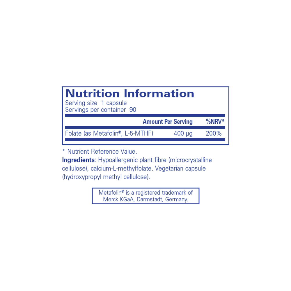 Folate 400 by Pure Encapsulations contains 400 mg of folate. It comes in an active form of folic acid, which can by universally metabolised, including by those who have a genetic mutation where they cannot convert folic acid into folate.