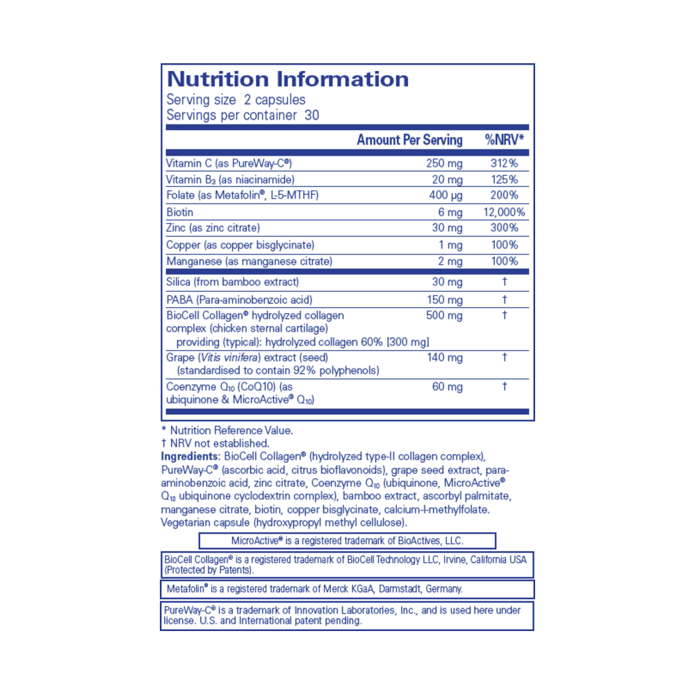 Hair Skin Nails Ultra by Pure Encapsulations is a supplement that contains key vitamins and trace minerals that support the health and maintenance of hair, skin and nails. It includes specially selected nutrients that contribute to normal collagen formation, which can help to improve the appearance of skin, reducing fine lines and wrinkles, and strengthen nails and hair. Also included is collagen in the form of clinically studied BioCell Collagen®, along with other nutrients that can support normal hair and skin pigmentation.