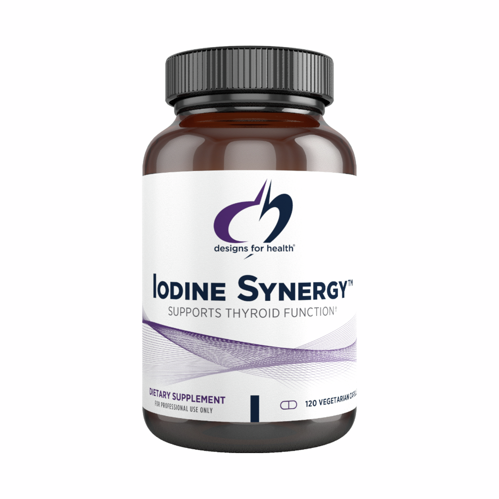 Iodine Synergy™ contains potassium iodide for supporting normal thyroid function, including balanced production of thyroid hormones and the health of breast and prostate tissue. Potassium iodide is a weak salt and easily splits apart in the gut, leaving free iodide ions to join together forming I2 iodine. The selenium in this product works synergistically with iodine to support the normal conversion of T4 into T3 and supplies antioxidant protection to the thyroid gland.