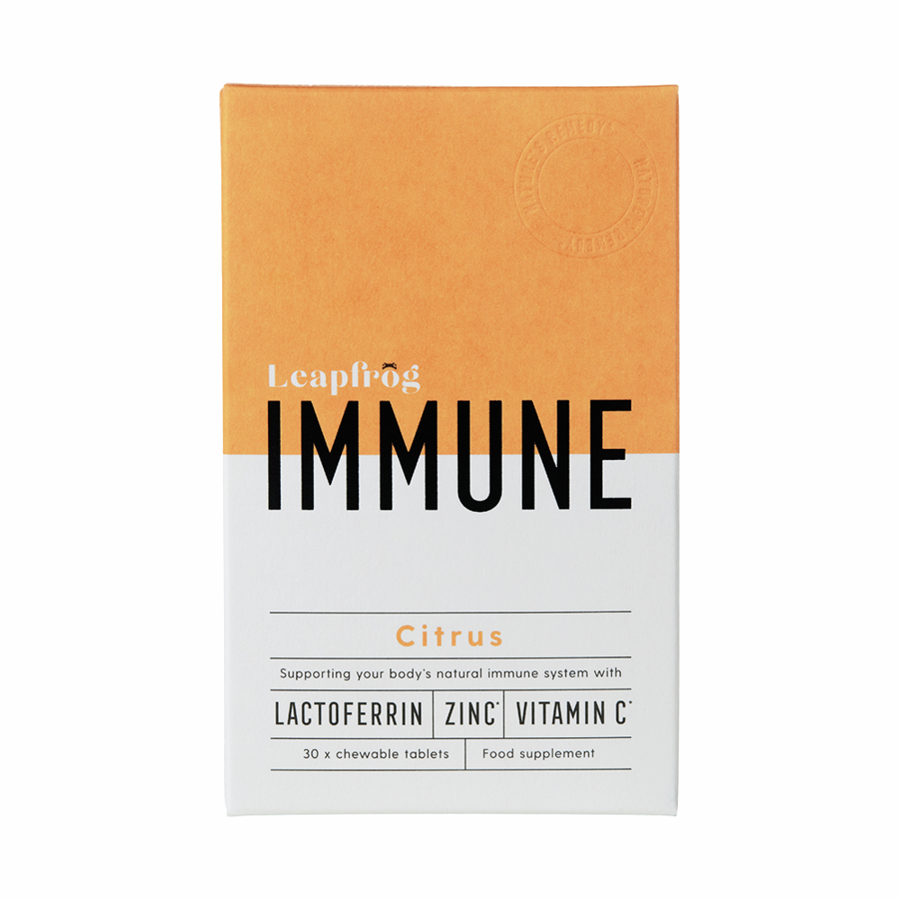 Leapfrog IMMUNE chewable tablets support the body with premium grade Lactoferrin (sourced from cow’s milk), Zinc & Vitamin C.