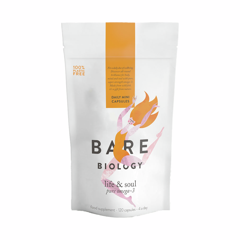 Life & Soul Pure Omega from Bare Biology contains a high dose of omega 3 for all around daily wellbeing. Each dose (2 capsules) contains the same amount of omega 3 as a whole tin of sardines with bones. Omega 3 is an essential nutrient for achieving optimal health.