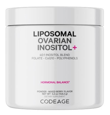 Codeage Liposomal Ovarian Inositol+ powder is a nutritional supplement designed for women, created to help support ovarian well-being and hormone equilibrium by incorporating Myo-inositol, D-chiro-inositol, 5-MTHF folate, CoQ10 phytosome, wild blueberry, and pomegranate extracts. Features liposomal delivery for absorption and bioavailability.
