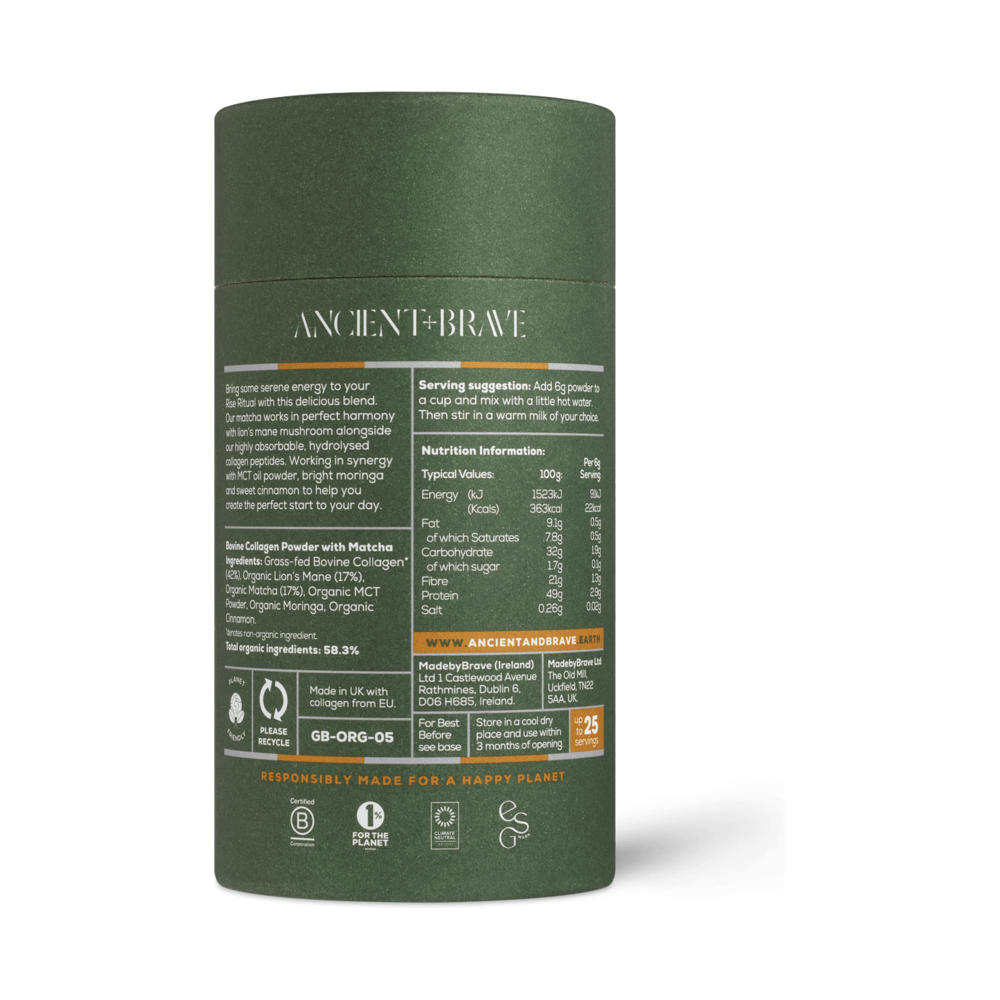 The perfect harmony of organic matcha paired with Ancient + Brave's signature True Collagen peptides and pure organic Lion’s Mane mushroom to dial in a clear mind and nourish your skin from within.