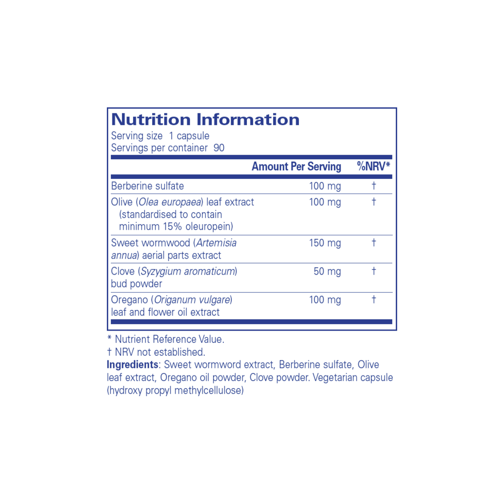 This formula includes powerful botanicals that help the body naturally fight microbial imbalances. It can be effective against candida and fungal overgrowth. Oregano contains compounds that have potent antimicrobial properties and support healthy gastrointestinal function as well as combat respiratory infections. Sweet wormwood and clove further enhance the antioxidant properties of this formula and help fight parasitic infections.