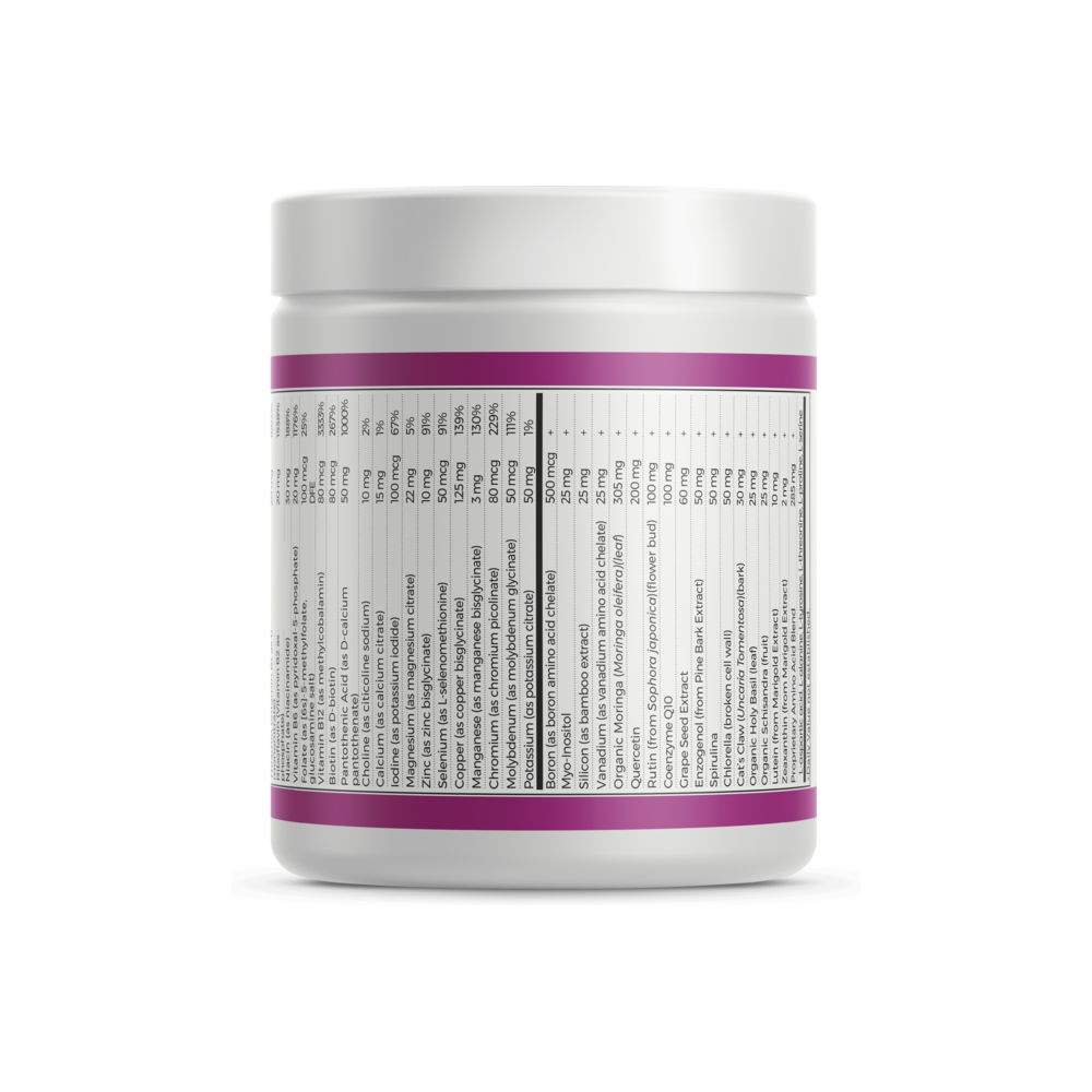 An array of vitamins, minerals and flavonoids that offer a complete formulation in powder formula, easy to add to your favourite drink. Supports immunity and antioxidant capacity, it can also be beneficial to prevent allergies and supports all the organs and systems in your body. With specific antioxidants to support eye health and cardiovascular health.