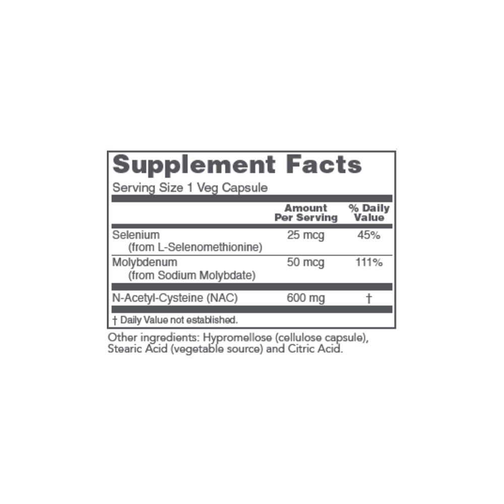 NAC is a reliable form of the non-essential amino acid cysteine. NAC not only possesses its own free radical scavenging activity, but it also plays a crucial role in supplying cysteine to the body. This enables the production and replenishment of glutathione, our body's master antioxidant, providing protection against harmful free radicals. What sets this formula apart is the inclusion of two trace minerals: molybdenum, an essential cofactor for numerous biochemical reactions, and selenium, known for its ability to support glutathione production.