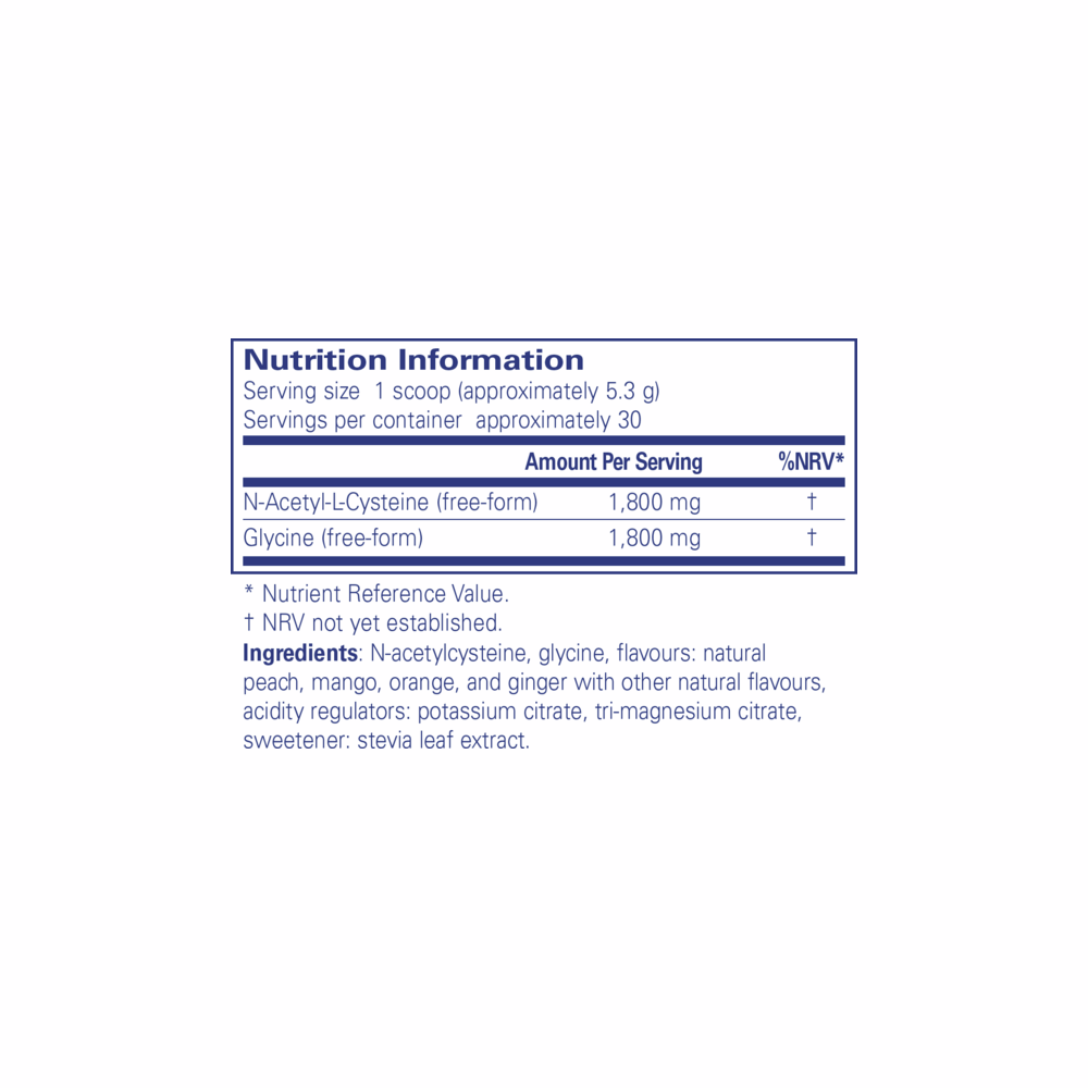NAC + Glycine Powder provides 1.8 grams of both N-acetylcysteine (NAC) and glycine per serving in a great-tasting natural peach-ginger flavour. NAC and glycine are both involved in glutathione synthesis. Co-supplementation with NAC and glycine may be more effective than either amino acid alone.