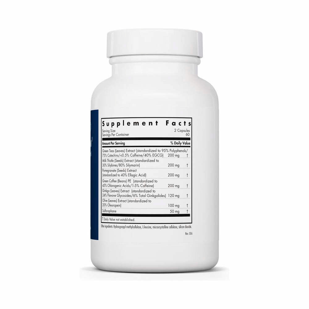 Green Tea (Camellia Sinensis), Milk Thistle (Silybum Marianum), Pomergranate (Punica Granatum), Green Coffee (Coffea Arabica) Ginkgo Bilioba, Olive Leaf (Olea Europea) Sulforophane, L-Leucine, Microcrystalline Cellulose (E460i), Silicon Dioxide (E551). Capsule Shell: Hydoxypropyl Methylcellulose (E565).