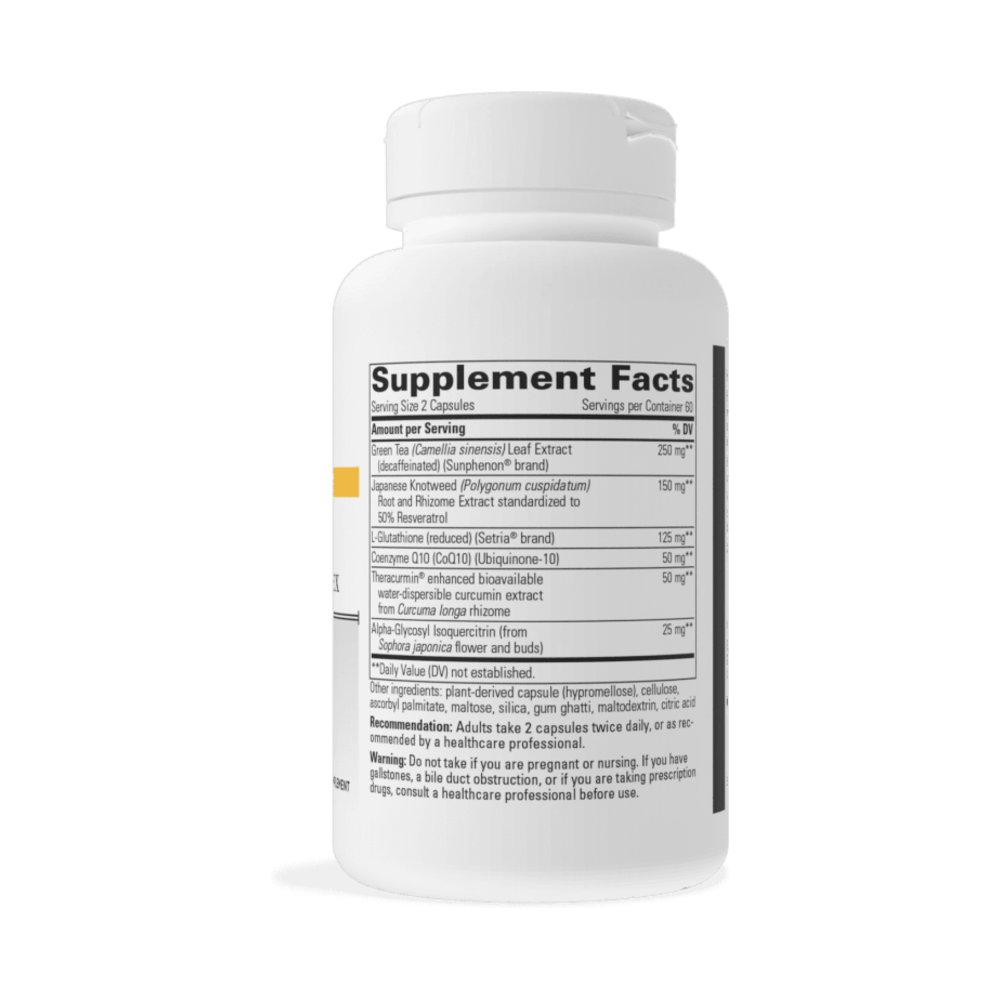 - CoQ10, curcumin extract, green tea extract, l-glutathione support the body's antioxidant pathways