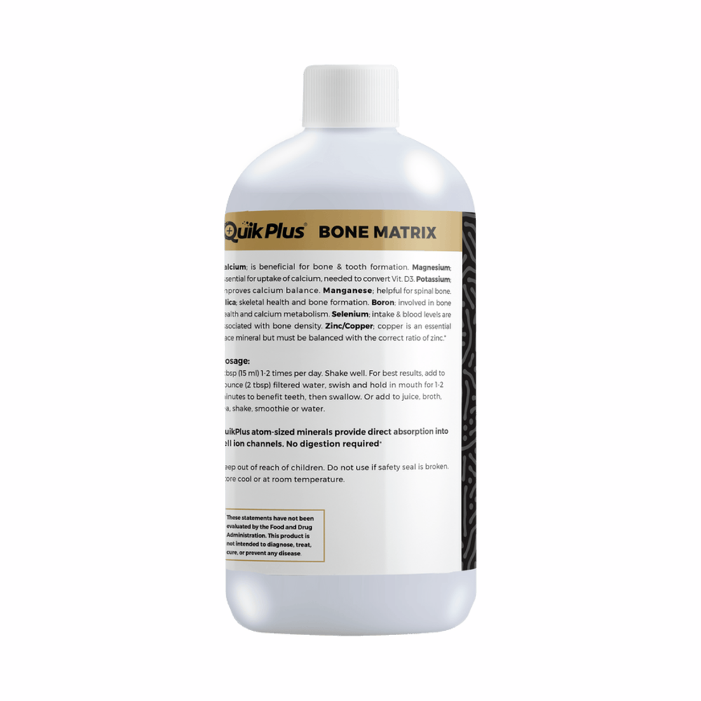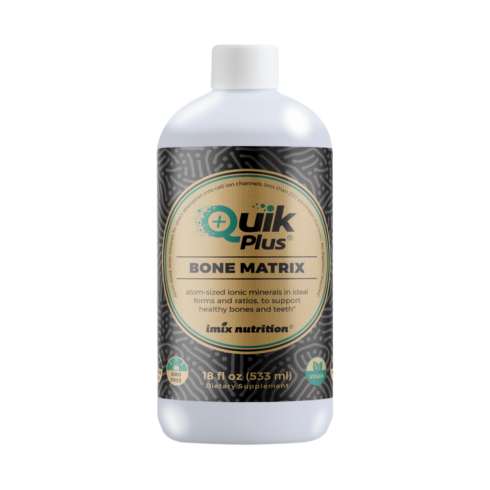 QuikPlus Bone Matrix contains atom-sized ionic minerals that can be absorbed directly into your cells. Taking this formula supports healthy bones and teeth as it contains all the minerals needed for bone formation.