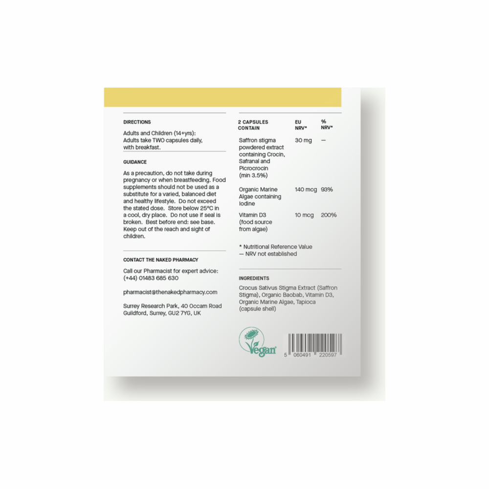 Saffrosun contains saffron extract at the highest concentrations to support the nervous system, reduce tiredness and fatigue and promote restful sleep. This formulation also offers naturally sourced marine algae, high in natural minerals and iodine. Vitamin D3 helps to support brain and cognitive function, whilst Baobab offers probiotic activity to enhance gut health, because of the strong connection between gut health and brain health. As this formulation contains iodine it should not be taken by those with an overactive thyroid gland.