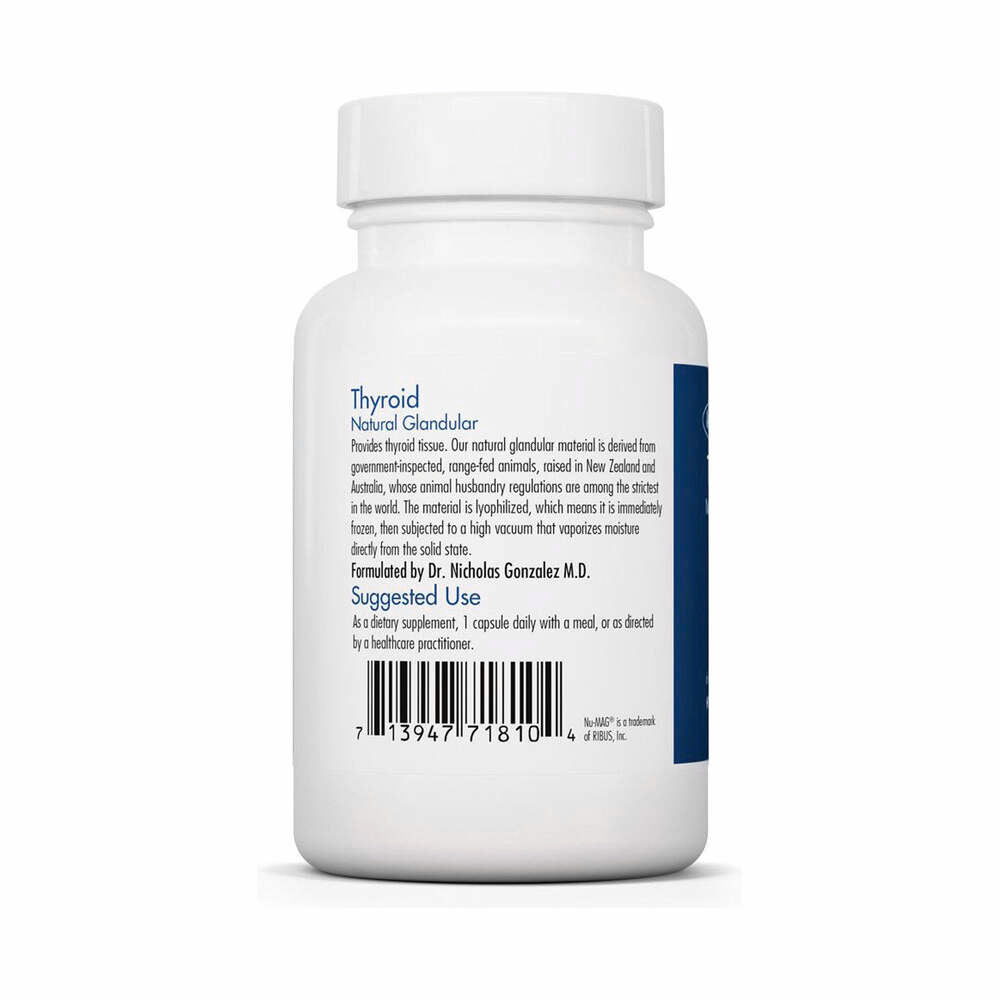 Provides thyroid tissue. Our natural glandular material is derived from government-inspected, range-fed animals, raised in New Zealand and Australia, whose animal husbandry regulations are among the strictest in the world. The material is lyophilized, which means it is immediately frozen, then subjected to a high vacuum that vaporizes moisture directly from the solid state. Formulated by Dr. Nicholas Gonzalez M.D.