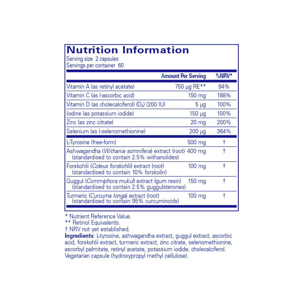 Thyroid Support Complex is designed to support overall thyroid health and function, and boost the production of thyroid hormones. It contains iodine, which is needed for a healthy thyroid, along with additional vitamins and minerals that are needed as cofactors. Ashwagandha has also been included, which is an adaptogen that can help the body to cope with stress, as well as support sleep. It also contains antioxidants, which help to protect the body from the damage caused by free radicals.