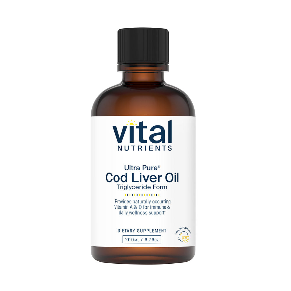 Ultra Pure® Cod Liver Oil by Vital Nutrients is a high quality cod liver oil, providing a potent source of essential omega-3 fatty acids. Omega-3 is an essential nutrient that is anti-inflammatory and can be particularly beneficial for brain and cardiovascular health for both adults and children. It also contains naturally-occurring vitamins A and D which can support the immune system and skin health.