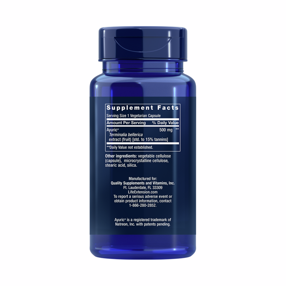 Uric acid is formed when the body breaks down purines, which are organic compounds serving functions in our genetic material and other activities such as neurotransmission. Most purines are made naturally in the body, and the rest come from the diet. Ayuric® is a clinically studied, vegan, water-soluble product and a standardized extract from a tannin-rich extract derived from the edible fruit of the Terminalia bellerica. It has antioxidant properties that can support healthy uric acid levels.