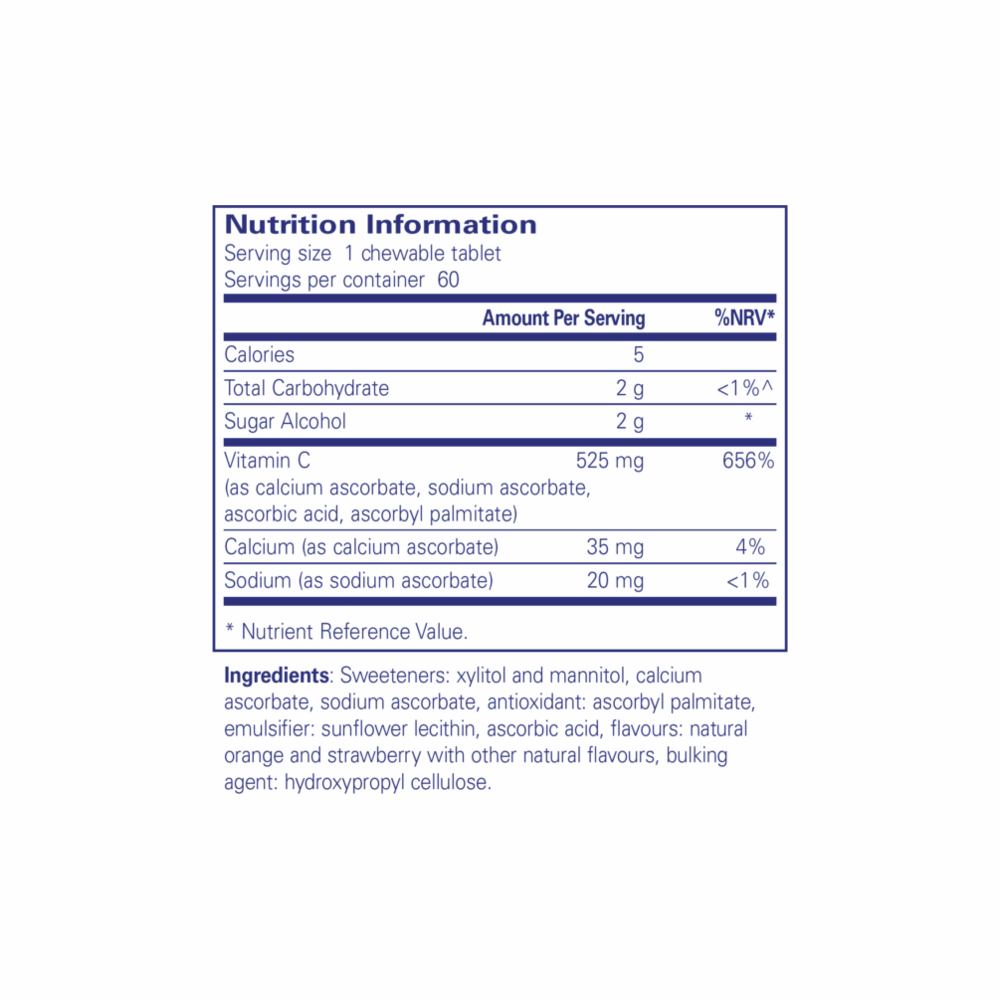 Vitamin C Chewable provides vitamin C as a great tasting and convenient chewable tablet. With natural orange/strawberry flavour. Made with mineral ascorbates to be gentler on the stomach. Vitamin C contributes to the normal function of the immune system. Vitamin C contributes to normal psychological function and functioning of the nervous system. Vitamin C contributes to the reduction of tiredness and fatigue.