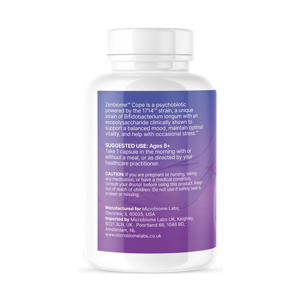 ZenBiome Cope™ pairs the well-researched psychobiotic 1714™ with other vital nutrients like B vitamins and herbal extracts to provide targeted support for coping with day-to-day, periodic stressors and mood changes.
