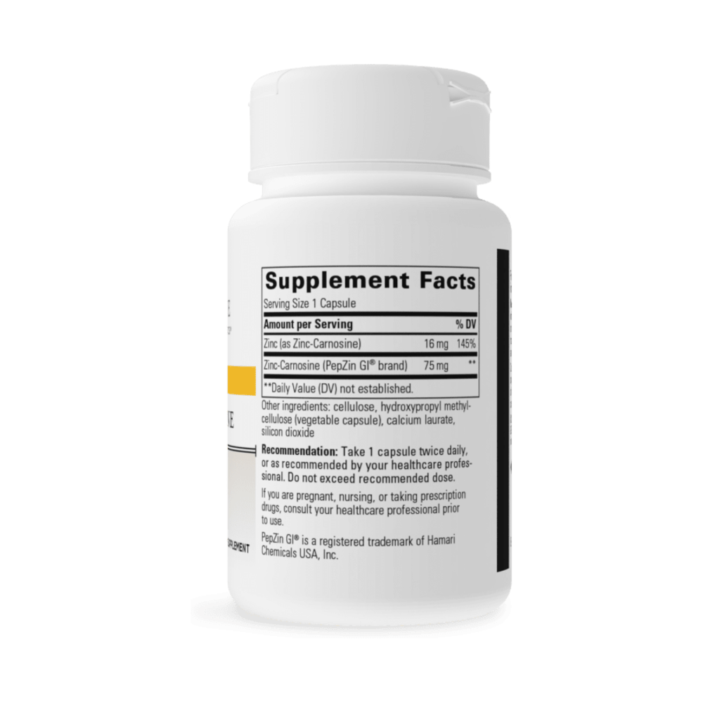 Zinc Carnosine contains the PepZinGI brand of zinc-carnosine to support healthy gastrointestinal mucosa and relieve occasional mild gastric discomforts.